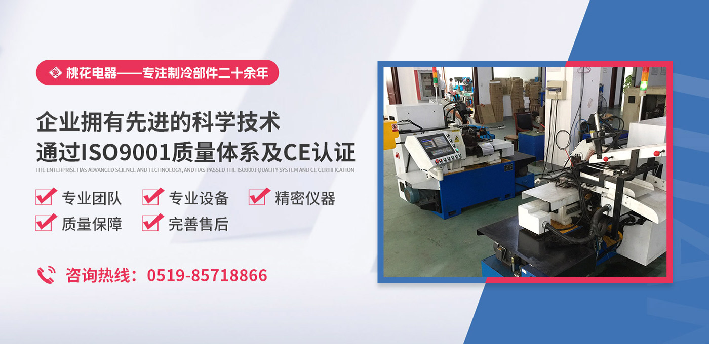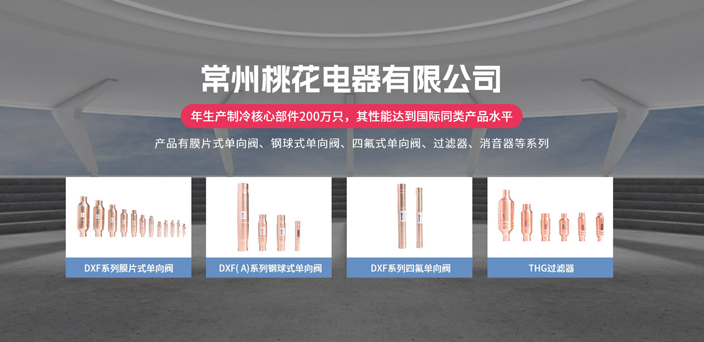 常州桃花電器有限公司地處中國長江“金三角”之稱的上海至南京高速公路、城際高鐵、常州高新經濟技術開發區路段,交通便利、技術力量十分雄厚。它是集研究、開發設計、制造和經營制冷核心部件的企業,主要生產中央空調上使用的制冷部件。產品有膜片式單向閥、鋼球式單向閥、四氟式單向閥、過濾器、消音器等系列。年生產制冷核心部件200萬只,其性能達到國際同類產品水平。  企業擁有先進的科學技術、國際先進的生產加工設備和精密的檢測儀器,并已通過ISO9001質量體系及CE認證,公司歷史悠久,2000年起,經過長期積累、沉淀,經驗豐富,從而保證了產品的高質量、高性能、高耐用性。企業產品在國內外市場具有較高的知名度,深受眾多中外品牌制冷客商的好評。主要客戶有約克、麥克維爾、美的、開利、特靈、頓漢布什、清華同方、天加等.并出口北美、歐洲、東南亞等地區?! 「咂焚|產品是企業的保證,周到服務是合作友誼的承諾,企業本著“求